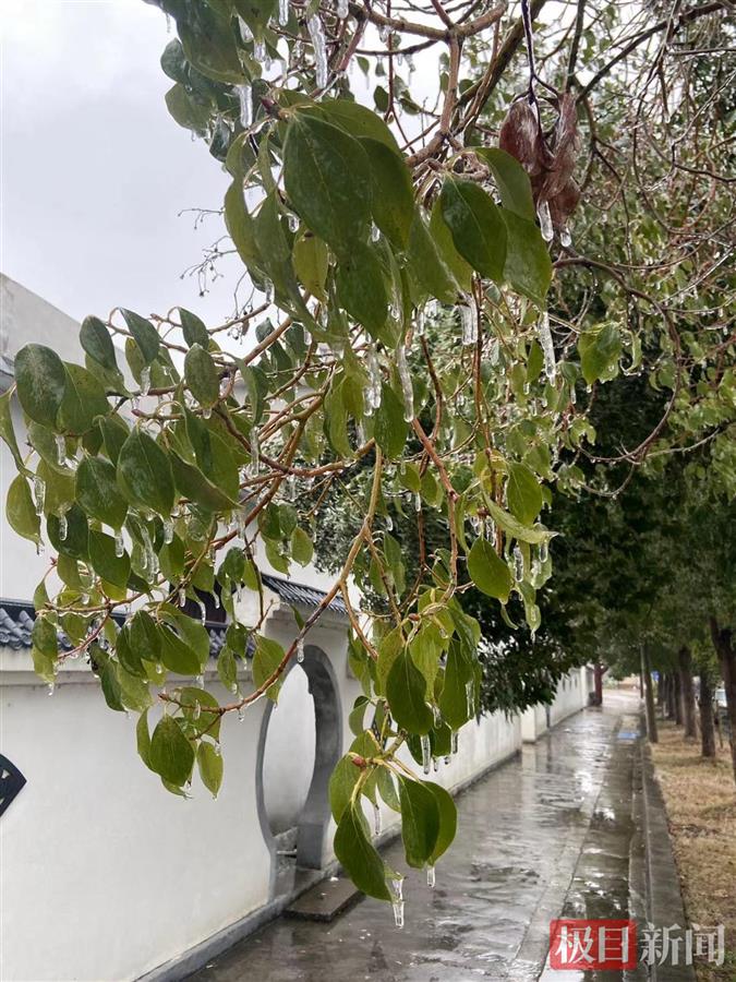 梅花、茶梅以及低矮灌木上的叶片都穿冰衣啦,“裹上水晶了!”武汉市民余先生拍下这少见美好的景致。