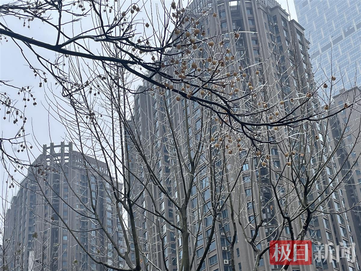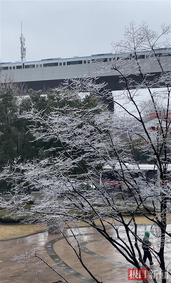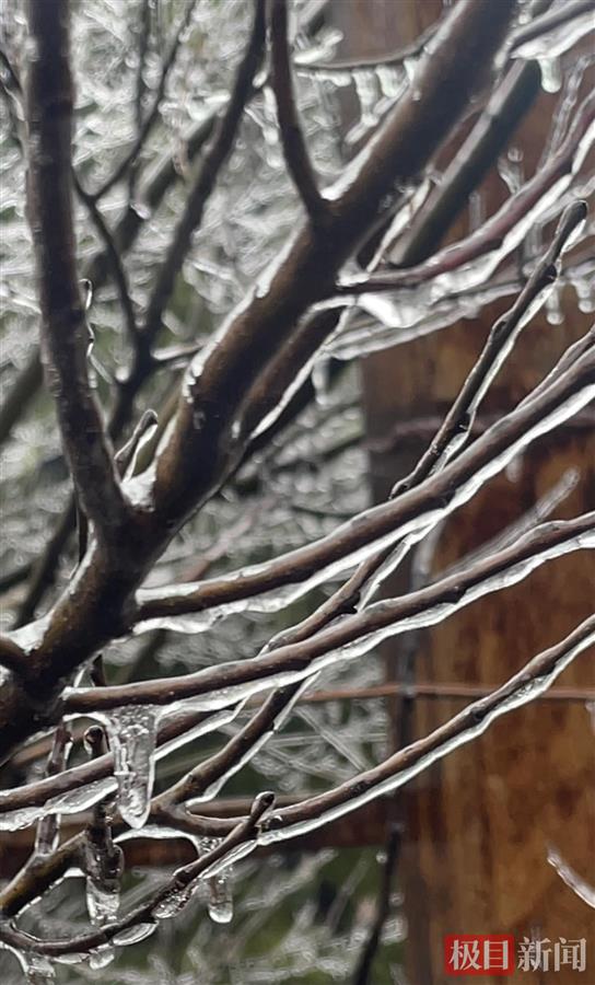 今日(2日),走在武汉街头,你会发现干枯的树枝成了水晶棒,一树枯枝冰清玉洁,远处看像一树冰花。