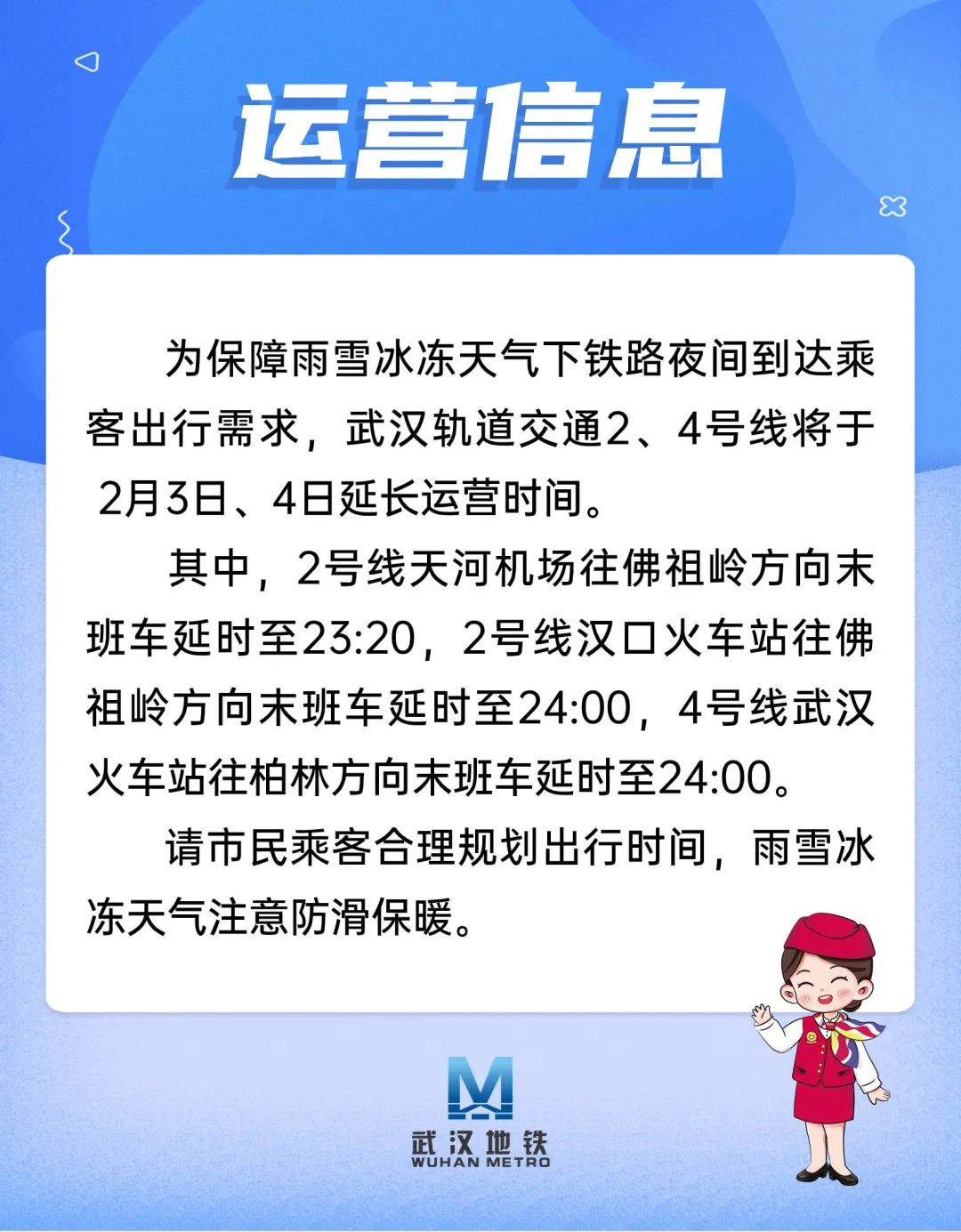 为保障雨雪冰冻天气下铁路夜间到达乘客出行需求,武汉轨道交通2、4号线将于2月3日、4日延长运营时间。