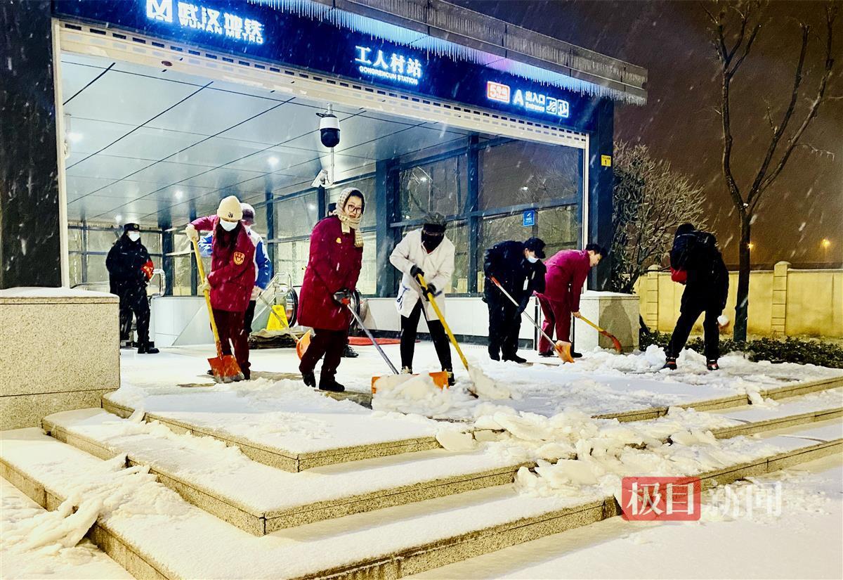 清晨4时许,5号线工人村站工作人员清除出入口积雪