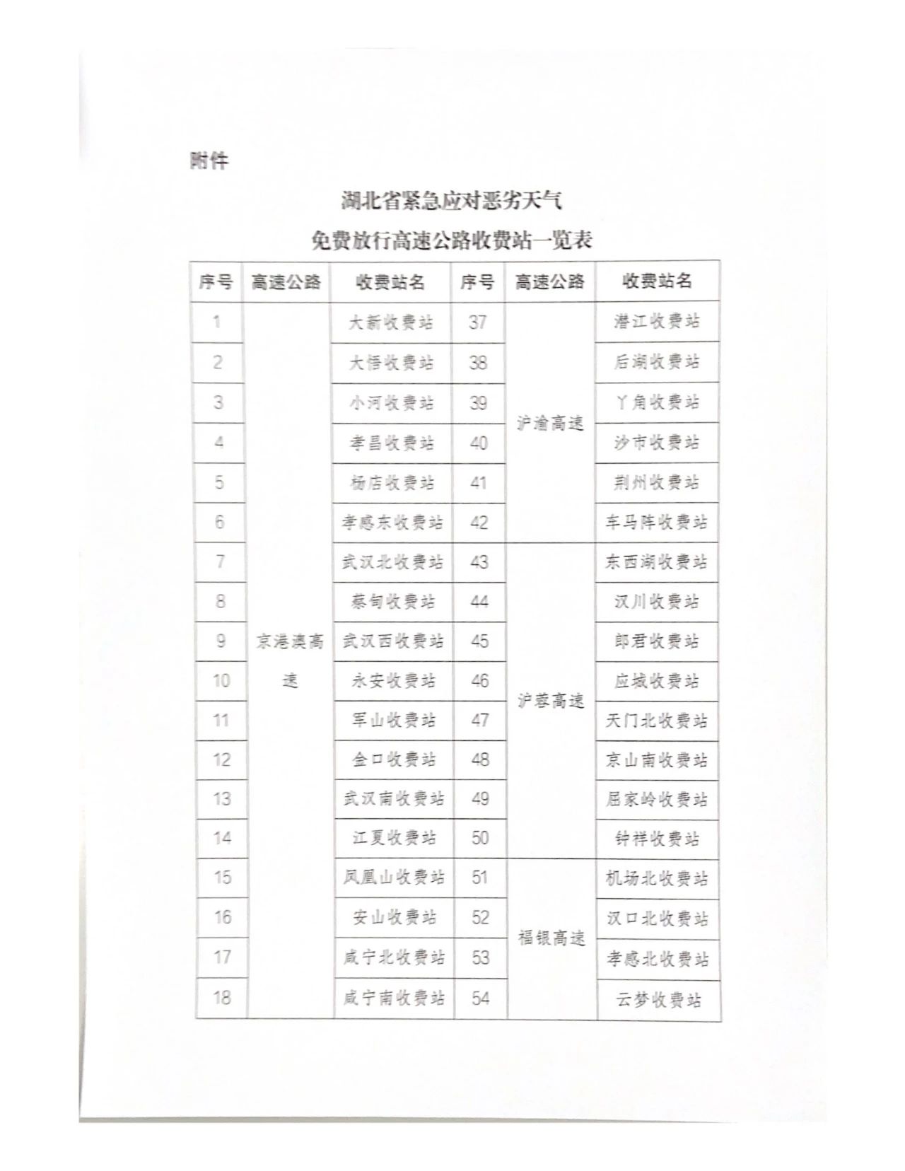针对近日湖北省境内部分高速公路路段因恶劣天气造成车辆拥堵严重的情况,结合最新天气预报及路网运行情况,经省人民政府和交通运输部同意,调整免费放行收费站所及时间区间,自2024年2月5日20:00至6日12:00,对在指定收费站(详见附表)驶出高速公路的所有车辆实施免费放行。