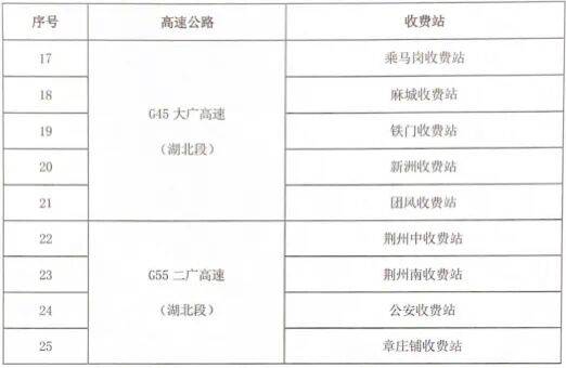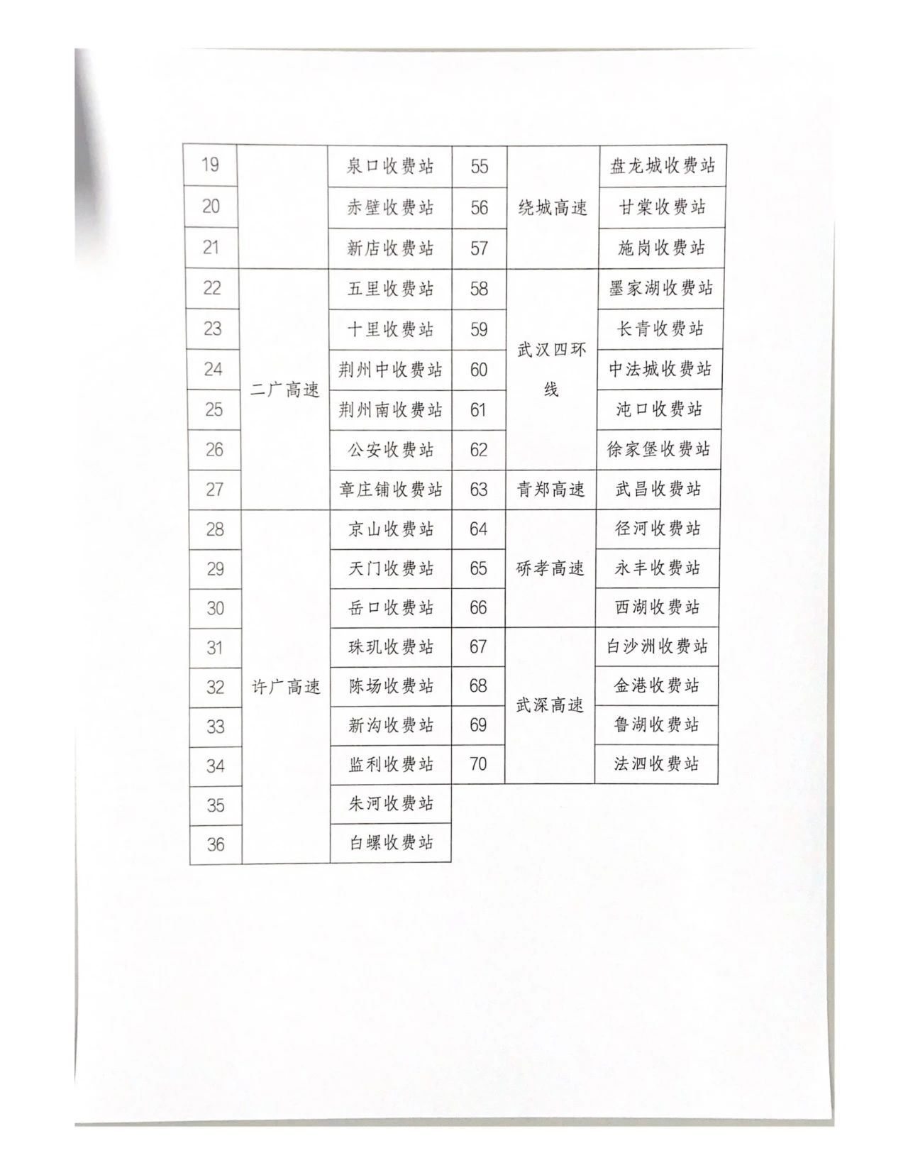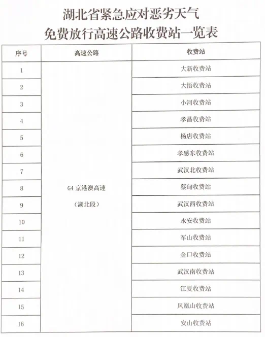 因冰雪,①临时管制的收费站:G4京港澳高速大新至金口段收费站,G0421许广高速淮河至三里岗段、宋河至朱河段收费站,G0422武深高速白沙洲至崇阳西段收费站,G0424武大高速全线收费站,G42沪蓉高速黄陂北至黄陂东段、东西湖至石牌段收费站,G4201武汉绕城高速花山至施岗段收费站,G4213麻安高速铁门西至大洪山西段收费站,G4221沪武高速总路咀至青龙段收费站,G45大广高速麻城至兰溪段收费站,G50沪渝高速永安至枝江段收费站,G55二广高速黄集至襄阳南段、陈安至荆州中段、荆州桥南收费站,G70福银高速孝感北至上津段收费站,S11青郑高速武昌收费站,S13武监高速新滩至螺山段收费站,S15汉蔡高速全线收费站,S17硚孝高速径河、西湖收费站,S29麻阳高速向明河至浠水段收费站,S31黄咸高速马曹庙至太和段收费站,S33咸通高速咸宁北至南林桥段收费站,S38孝汉应高速全线收费站,S4214武红高速全线收费站,S40武汉四环高速全线收费站,S48张太高速全线收费站,S53枣石高速积玉口至石首东段收费站,S61沙公高速全线收费站,S63双尹高速全线收费站,S73邓保高速全线收费站,S74监江高速全线收费站,S77十淅高速丁家营收费站,S86赤洪高速全线收费站,S88岳宜高速石首至松滋西段收费站;②仅允许三型(含三型)以上货车通行(危化品车辆除外)的收费站:G4201武汉绕城高速柏泉至甘棠段收费站,G4京港澳高速安山至新店段收费站,G59呼北高速刘洞至郧阳南段、王家畈至渔洋关段收费站,G70福银高速机场北至汉口北段收费站,G7021武阳高速光谷南至红莲湖南段收费站,S7武鄂高速葛店至鄂州东段收费站,S13武监高速小军山至湘口段收费站,S17硚孝高速东山至毛陈段、永丰收费站,S53枣石高速新市至流水段收费站,S77十淅高速石鼓至龙山段收费站,S78蕲嘉高速张公收费站,S88岳宜高速枝城至宜都北段收费站;③限制“两客一危”车辆通行的收费站:G4221沪武高速杨柳至团陂段收费站,G42沪蓉高速木子店至红安段收费站,G45大广高速乘马岗收费站,G59呼北高速歇马至峡口段收费站,G7011十白高速全线收费站,S31黄咸高速金牛东收费站,S37龟峰山高速收费站,S78蕲嘉高速黄石新港至双溪段、向阳湖至嘉鱼北段收费站,S83十巫高速全线收费站;④仅允许七座以下小型客车和货车通行(危化品车辆除外)的收费站:S43孝洪高速燕窝收费站。