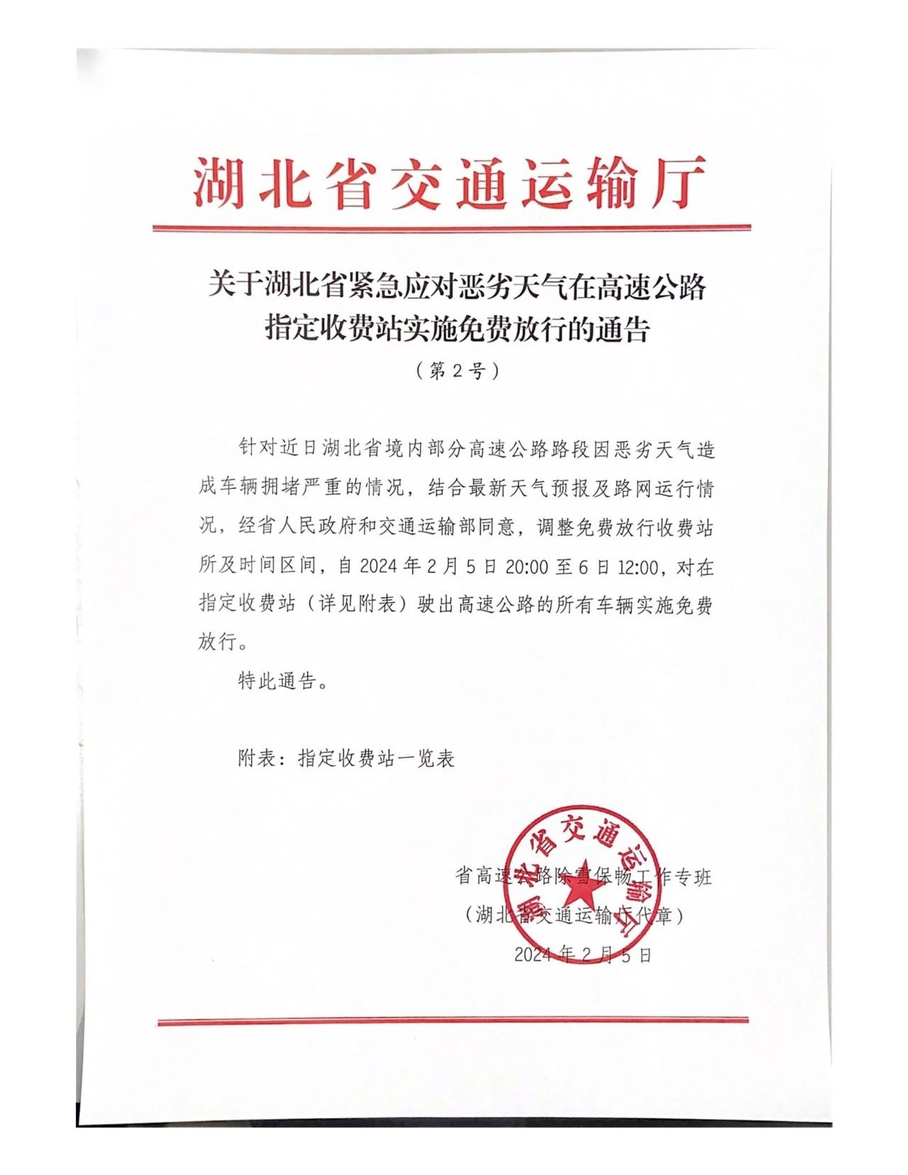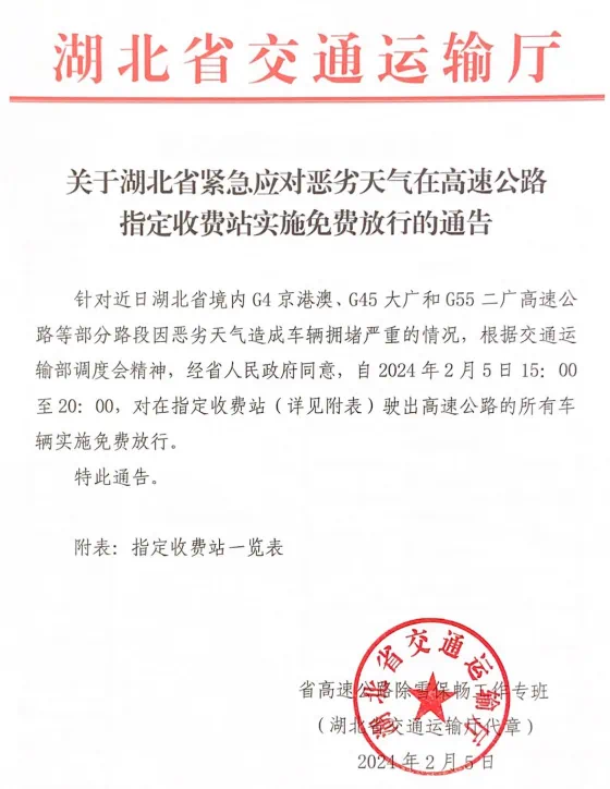 针对近日湖北省境内G4京港澳、G45大广和G55二广高速公路等部分路段因恶劣天气造成车辆拥堵严重的情况,根据交通运输部调度会精神,经省人民政府同意,自2024年2月5日15:00至20:00,对在指定收费站(详见附表)驶出高速公路的所有车辆实施免费放行。特此公告!