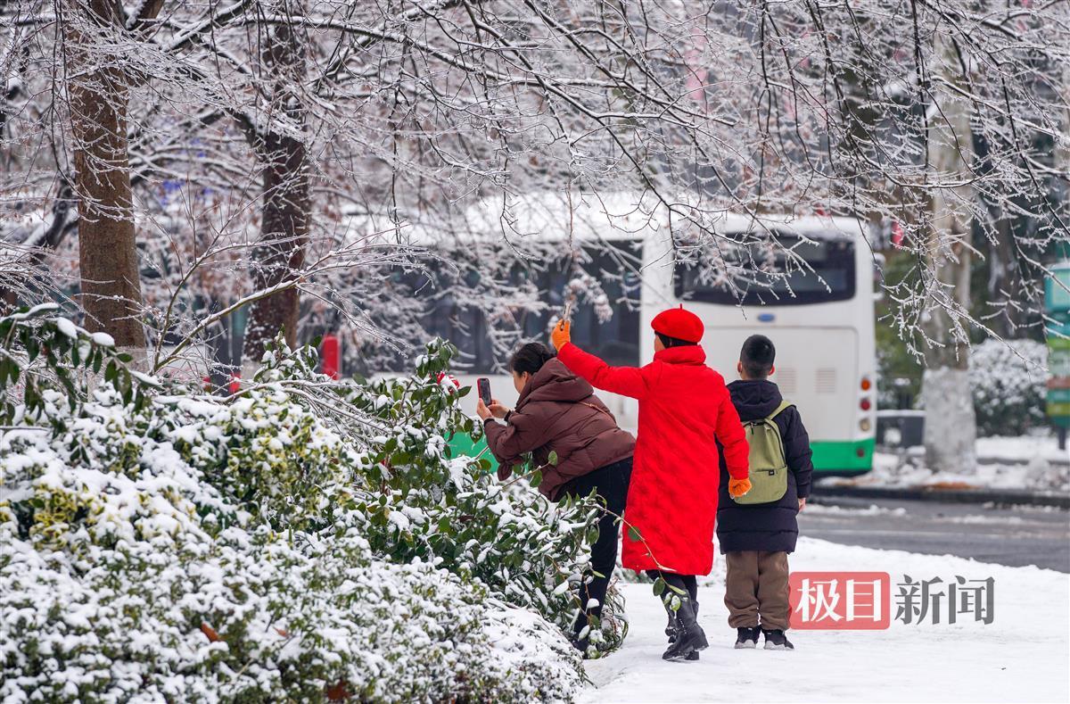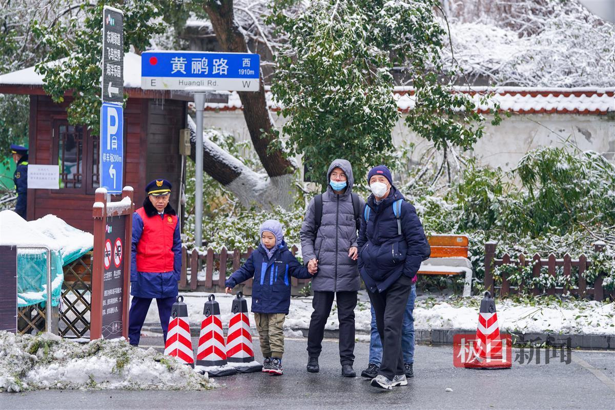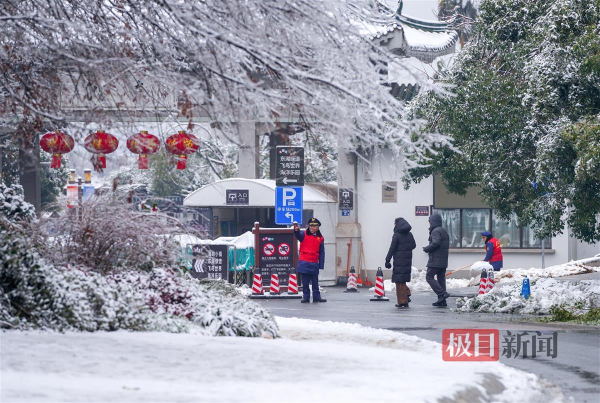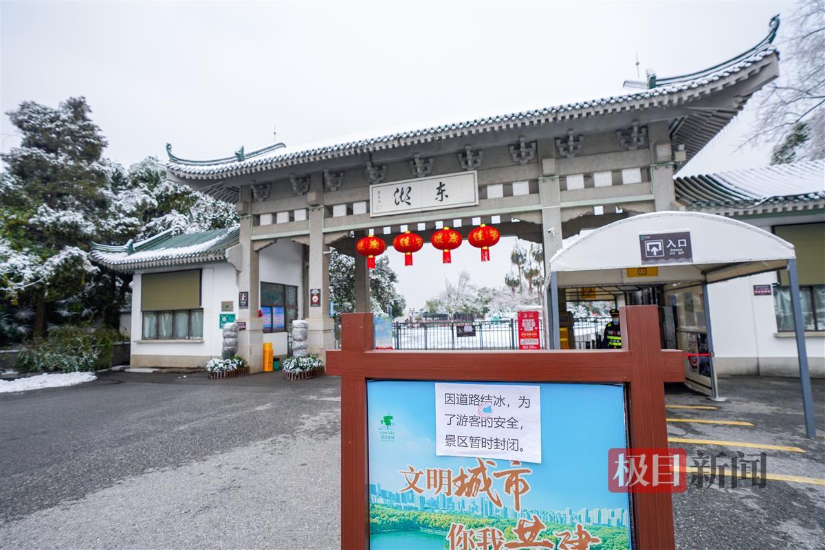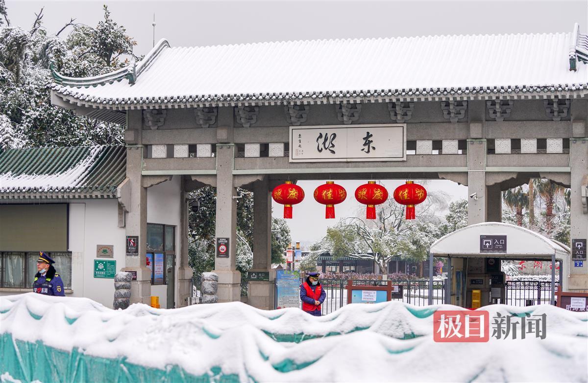 “亲爱的游客朋友,受天气影响,景区清理断枝,暂停对外开放,带来不便,敬请谅解!”当天上午9时30分许,极目新闻记者在听涛景区东湖大门看到,公园入口已关闭,门口不停播放广播,多名在大门口值守的工作人员也不停向前来游玩赏雪的游客耐心解释。不少前来踏雪的游客见状,只好在公园门口的小景点拍照打卡。