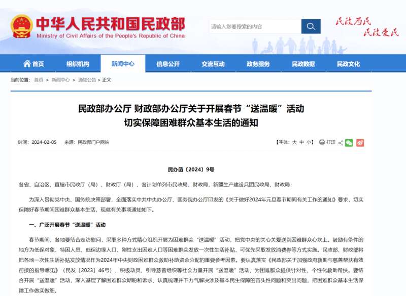 中国青年报客户端北京2月5日电(中青报·中青网记者先藕洁)近日,民政部办公厅、财政部办公厅联合印发《关于开展春节“送温暖”活动切实保障困难群众基本生活的通知》(以下简称《通知》),各地民政、财政部门要确保春节期间遇困群众求助有门、受助及时,及时足额发放各类救助金,强化因灾遇困群众生活救助等。