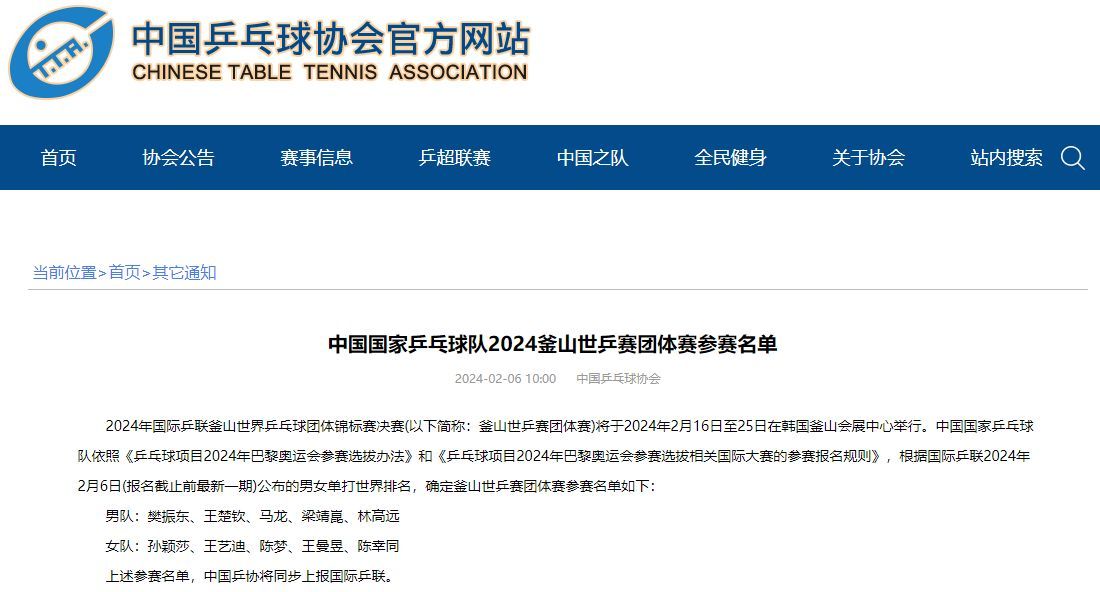 北京时间2月6日,中国乒协官网发布了中国国家乒乓球队釜山世乒赛团体赛参赛名单。中国国家乒乓球队依照《乒乓球项目2024年巴黎奥运会参赛选拔办法》和《乒乓球项目2024年巴黎奥运会参赛选拔相关国际大赛的参赛报名规则》,根据国际乒联2024年2月6日(报名截止前最新一期)公布的男女单打世界排名,确定釜山世乒赛团体赛参赛名单如下: