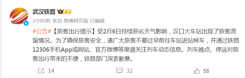 @武汉铁路微博发布公告称,受2月6日持续恶劣天气影响,汉口火车站出现了旅客滞留情况。为了确保旅客安全,请广大旅客不要过早前往车站进站候车,并通过铁路12306手机App或网站、官方微博等渠道关注列车动态信息。列车晚点、停运对旅客出行带来的不便,铁路部门深表歉意。