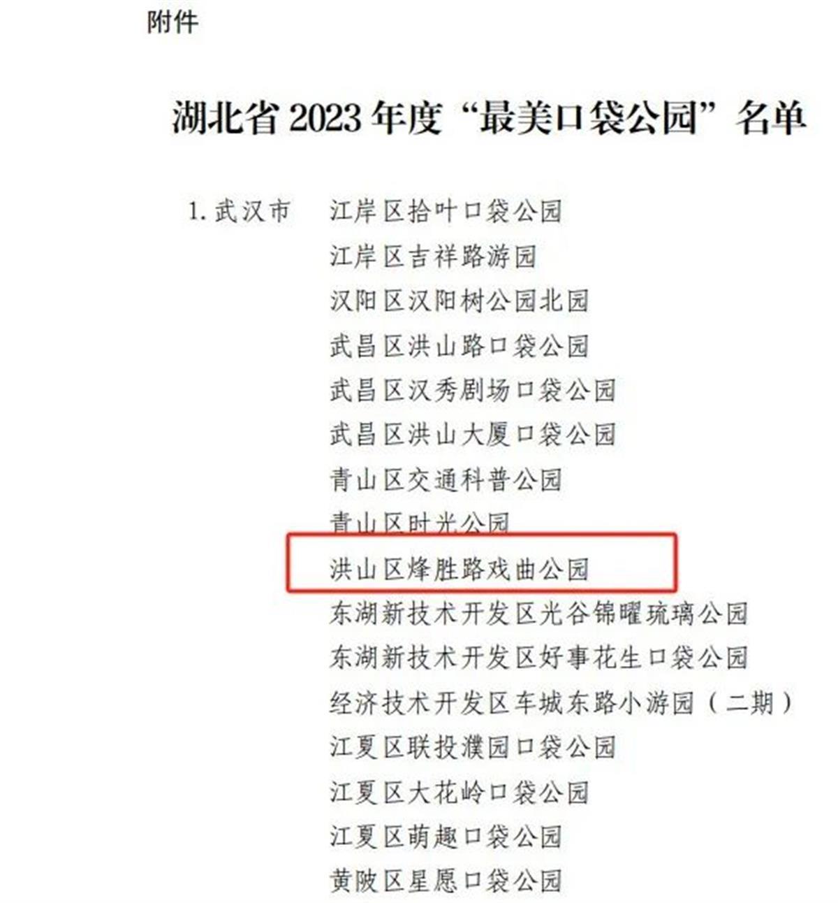 近日,湖北省2023年“最美口袋公园”评选结果出炉,武汉市16个口袋公园上榜,洪山区烽胜路戏曲公园位列其中。