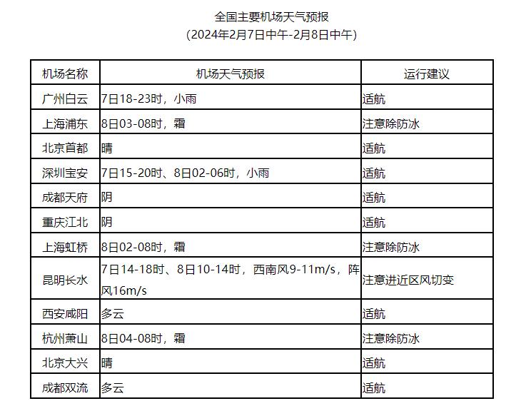2月7日傍晚至夜间,福州、厦门、台北等机场有短时阵雨;8日凌晨至早间,沈阳、天津、石家庄、青岛、郑州、武汉、虹桥、浦东、杭州、南京、合肥等机场有霜。