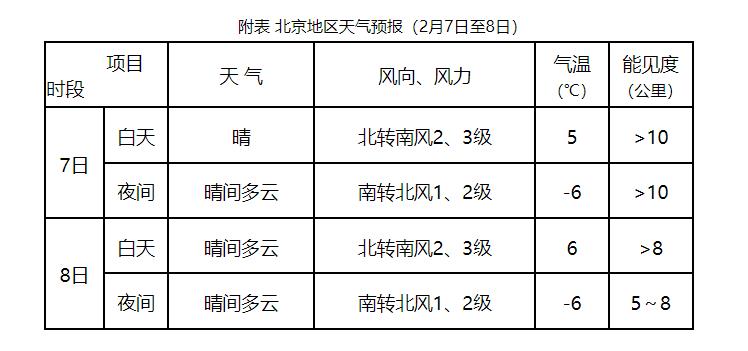 预计,2月7日至8日,北京地区天气以晴间多云为主,风力不大;7日至8日大部时段能见度较好,8日夜间有所转差,能见度5~8公里。未来两天,白天最高气温5~6℃,夜间最低气温-6℃左右。