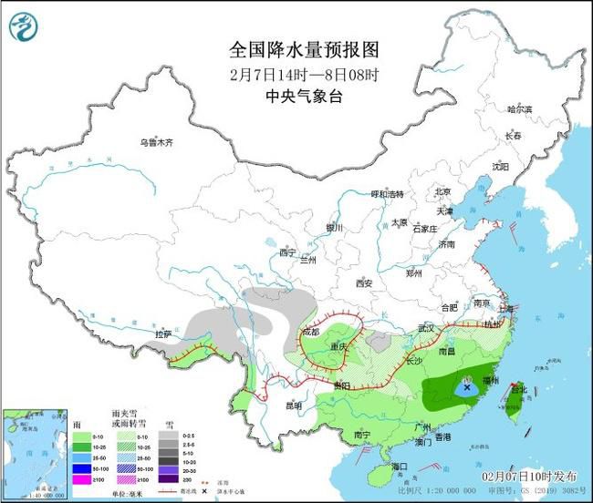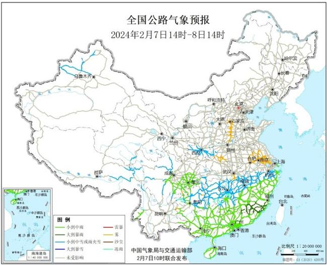 预计2月7日下午至8日下午,新疆西北部、青藏高原东部、川西高原北部和中部、贵州西部和东部、湖南北部和中部、江西北部、浙江北部等地部分地区有小到中雪或雨夹雪;贵州西部、湖南中部等局地有冻雨;江西东南部、福建南部等地部分地区有大雨。另外,河北南部、河南北部和西南部、江苏西南部、安徽东部、湖北东南部等地部分道路受雾影响能见度低(见图3,附件1)。