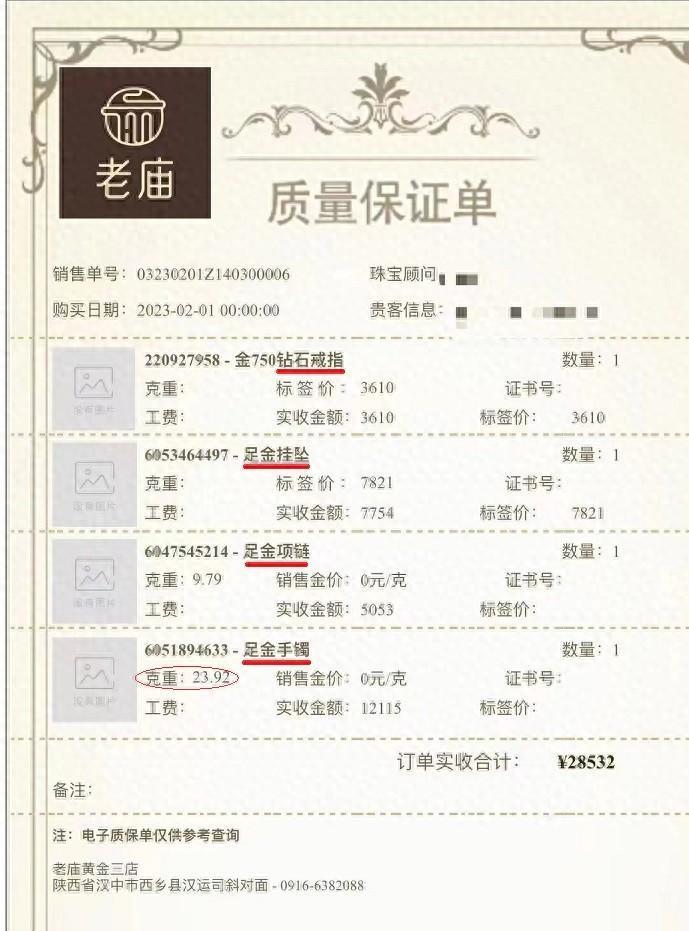 根据金店的《质量保证单》显示,王先生当时购买的金饰包括:足金手镯,23.92克,12115元;足金项链,9.79克,5053元;足金挂坠,7754元;钻石戒指,3610元。订单实收合计,28532元。