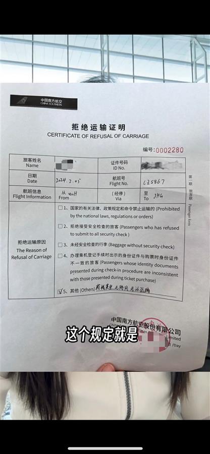 南航出具的拒绝运输证明