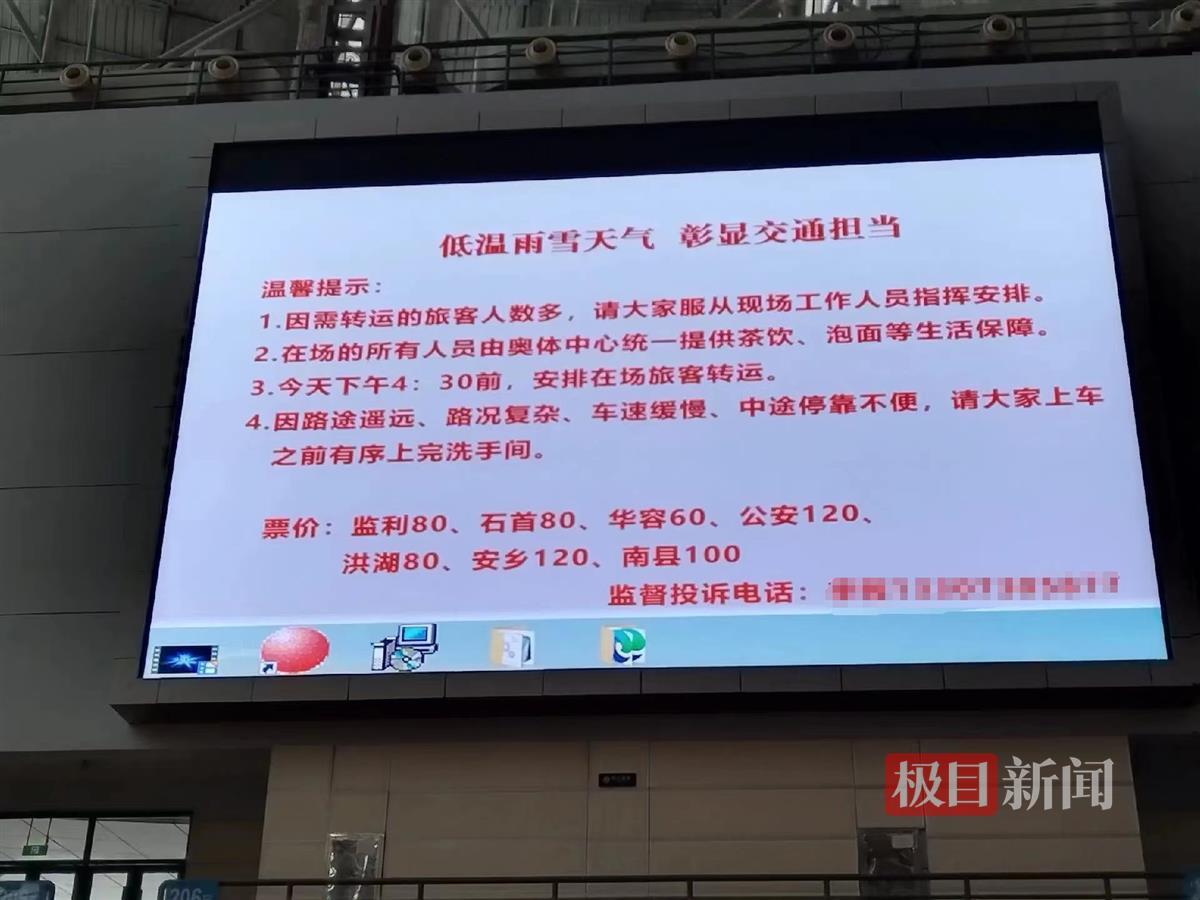 另一名被安置在体育馆的旅客张先生称,虽然汽车站停运,但当地政府组织的安置和转运方案很靠谱,有很多志愿者、政府工作人员在现场服务。张先生给极目新闻记者发来的体育馆内部的大屏照片中,有当地政府发布的温馨提示,提醒所有人员服从统一调度安排。大屏也公示了去往周边县市的车票价格,如监利80元、石首80元、洪湖80元、华容60元、南县100元等,还附有监督投诉的手机号码。