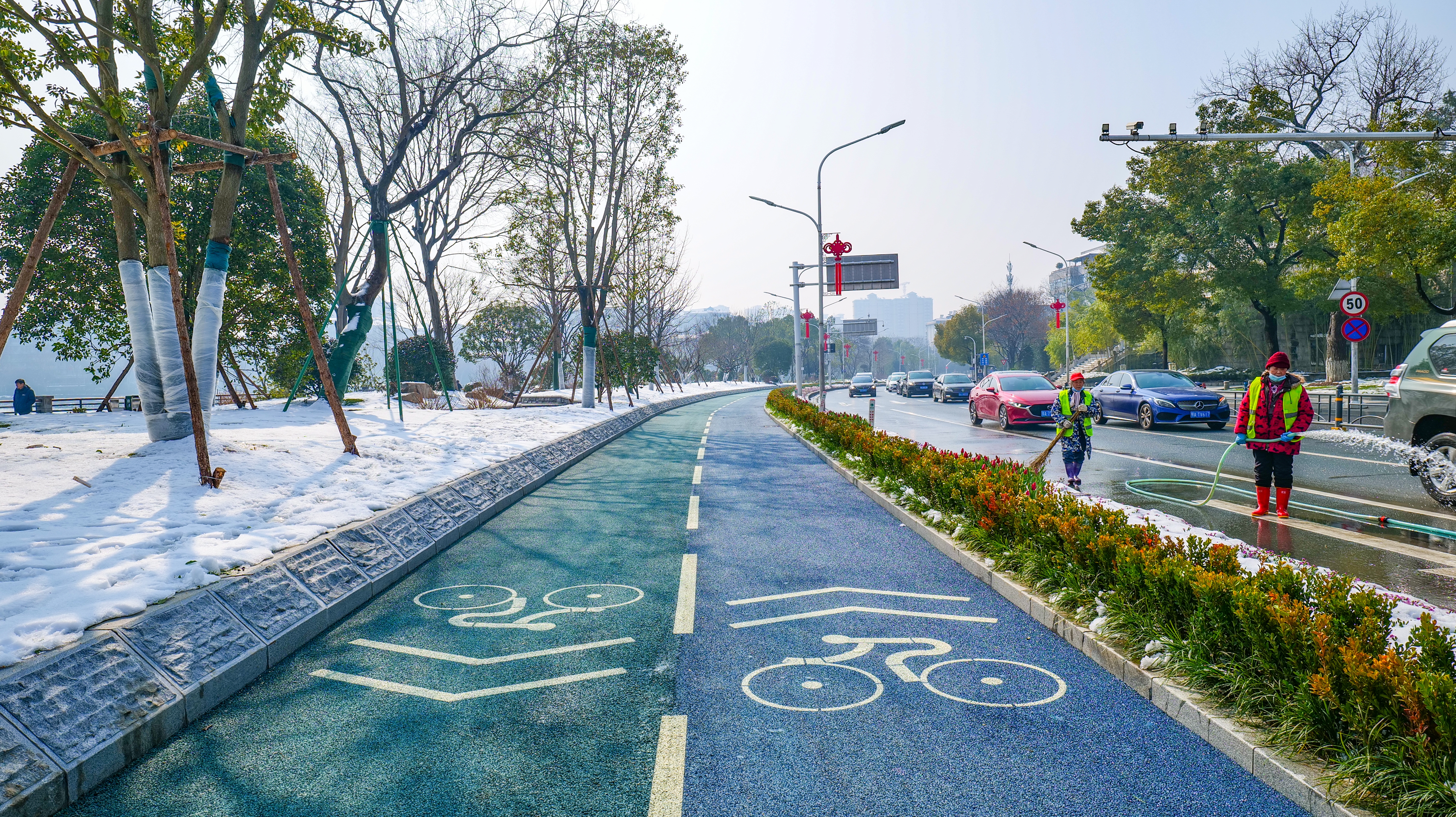 2月8日,记者现场看到,新修的绿道骑行道宽3.5米,可以双向骑行。为了保证骑行安全,同时丰富绿道景观,在绿道与天鹅路机动车道之间,修建了一条宽1.5米的绿化隔离带,上面种植花草树木。