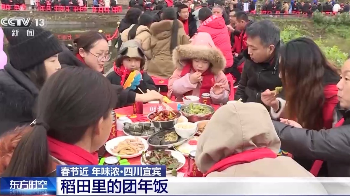 在四川宜宾市南溪区,当地政府组织村民们一起在稻田边办起稻田坝坝宴,庆祝一年来的丰收,喜迎春节。60多桌热气腾腾的团年饭,沿着村里的田坎依次排开。当地传统特色除了鸡、鸭、肘子、烧白等这些的“年味儿”菜肴,当地自产的早虾也端上了餐桌,成了团年饭的主角。