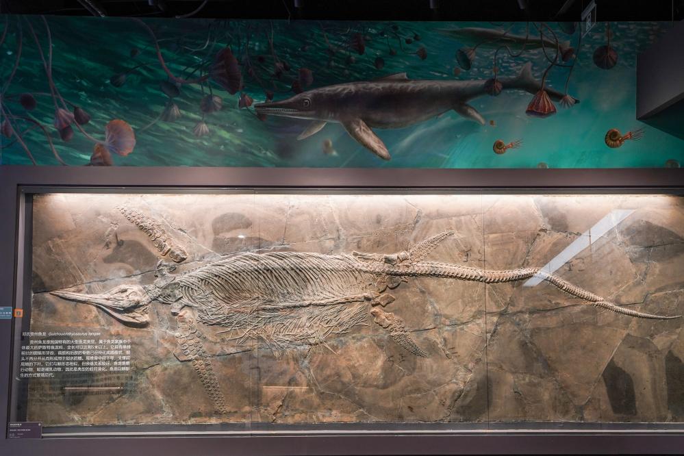南京古生物博物馆展出的鱼龙化石。新华社记者李博摄