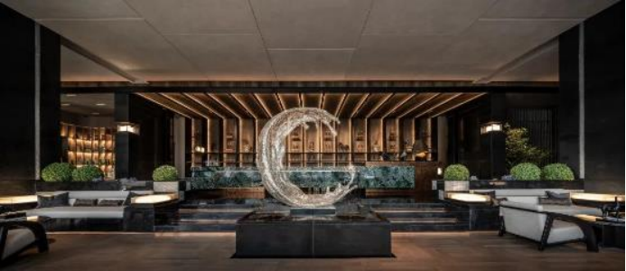 ◎ 归家动线用镜面涌泉,搭配高定艺术雕塑《江之波涛》