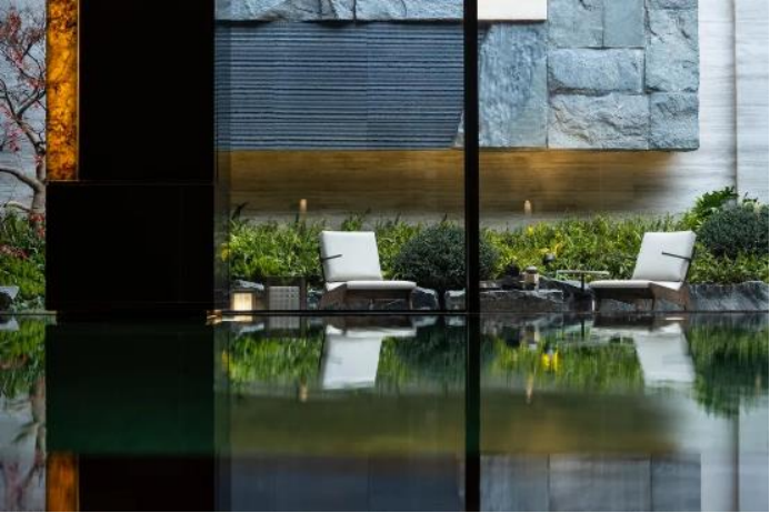 在地下空间,御湖境用约11米通高的整面劈山石,承接高处倾泻而下的灵动飞瀑,为下沉会所的无边泳池引入一道过目难忘的奇特风景。