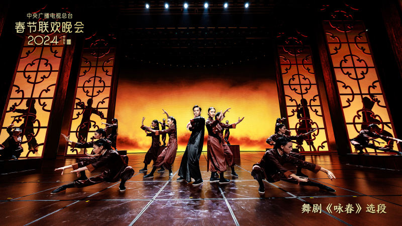 今年春晚北京主会场与辽宁沈阳、湖南长沙、陕西西安、新疆喀什四地分会场节目气韵贯通,国潮表演、歌舞说唱、器乐演奏等节目形式与地域特点巧妙融合,热潮一浪高过一浪。民歌串烧《我的家乡我的歌》集纳《太阳出来喜洋洋》《采茶舞曲》《山歌好比春江水》《谁不说俺家乡好》等众多经典民歌,耳熟能详的旋律描绘出山河锦绣的幸福年景。多彩演绎中国式浪漫中国传统纹样创演秀《年锦》选取汉、唐、宋、明四个朝代富有代表性的纹样,通过歌曲+虚拟合成技术,织出一幅跨越千载的纹样变迁图卷。刘涛、刘诗诗、李沁、关晓彤身着传统服饰,图案繁盛、细节有序的华服之美隐藏着河清海晏、繁荣昌盛的美好祝福。舞蹈《锦鲤》融合AI、XR等技术,舞者以飞天之姿化身水中锦鲤,点波流金,焕活舞台上的一池春水,令人惊艳。舞剧《咏春》选段配以剪影的舞台呈现效果,以“舞”演“武”,动静皆宜,行云流水。舞蹈《瓷影》生动演绎瓷器的诞生过程,清新脱俗的青白之色定格光洁温润的东方美。功夫微电影《争春》融合重庆铜梁非遗龙舞,再现中国武术经典招式,三龙聚首共贺新春。