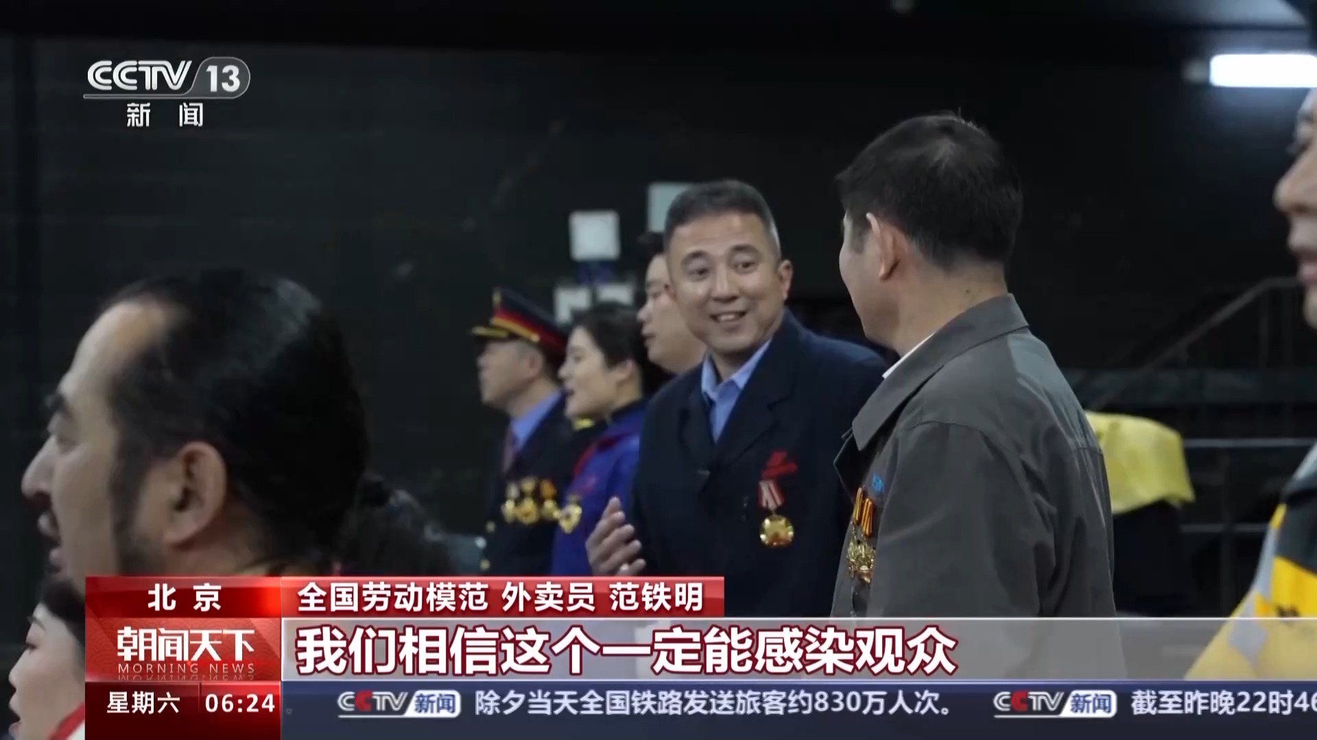 全国劳动模范、外卖员范铁明:在排练过程当中,我们整个参与的人都很激动。我们相信这个一定能感染观众,我们大家都怀揣着一个梦想,不论是儿时的还是现在的,都能够迸发出那种激情,好好爱自己,好好爱身边的人,好好爱我们的国家,好好爱这个世界。