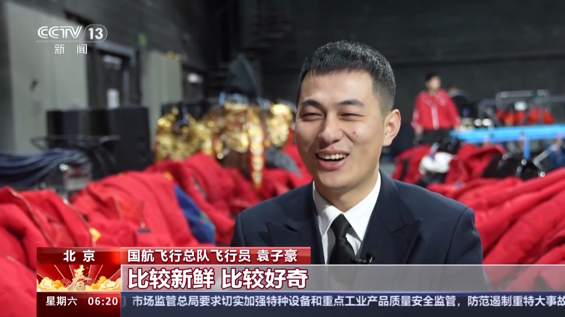 国航飞行总队飞行员袁子豪:我感觉自己还是对这个环境还比较新鲜,比较好奇。自己生活中也是一个“草根”吧,没想到也能有机会能站到央视春晚这么一个最高的舞台上。