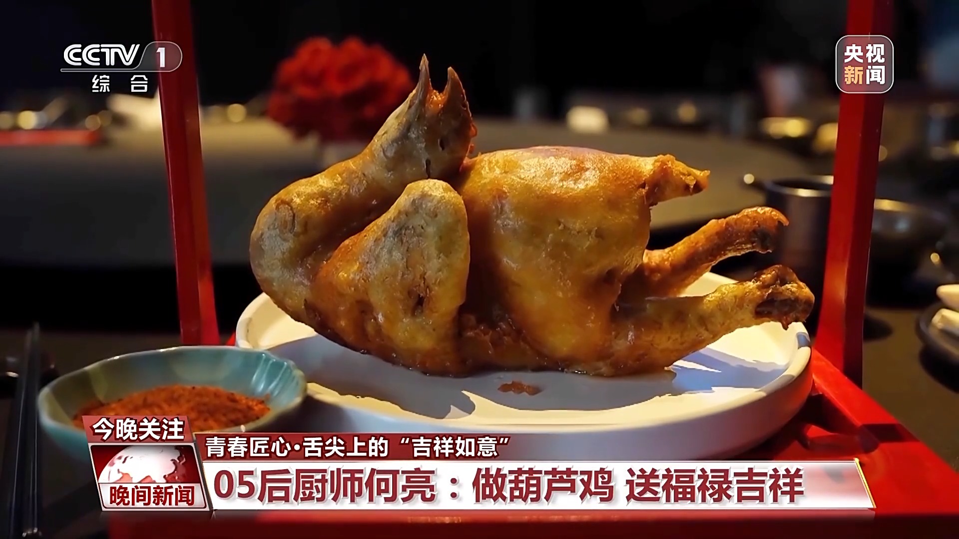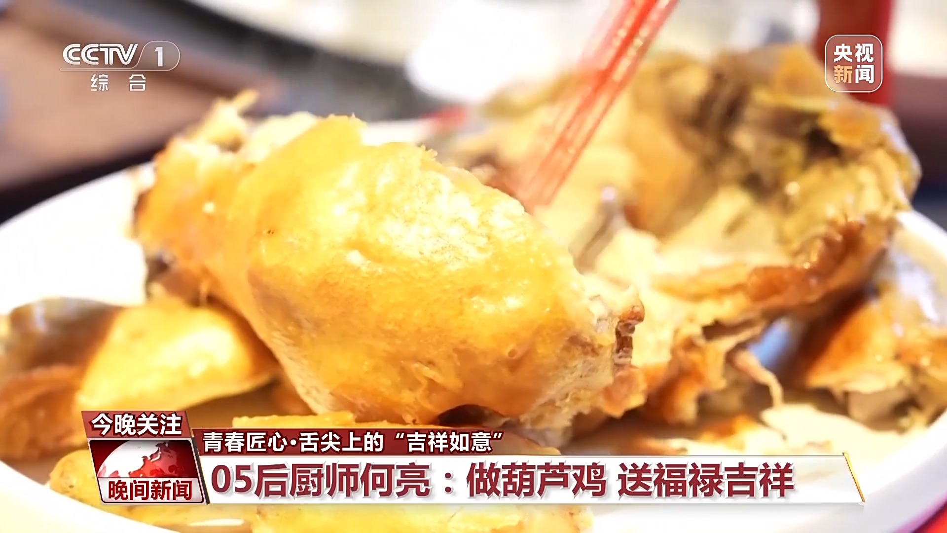葫芦鸡,是陕菜的代表性菜品之一,相传始于唐朝并一直流传至今,因其形似葫芦而得名,也有谐音“福禄”之意,深受喜爱。香味浓郁的葫芦鸡,是05后厨师何亮的拿手菜品。