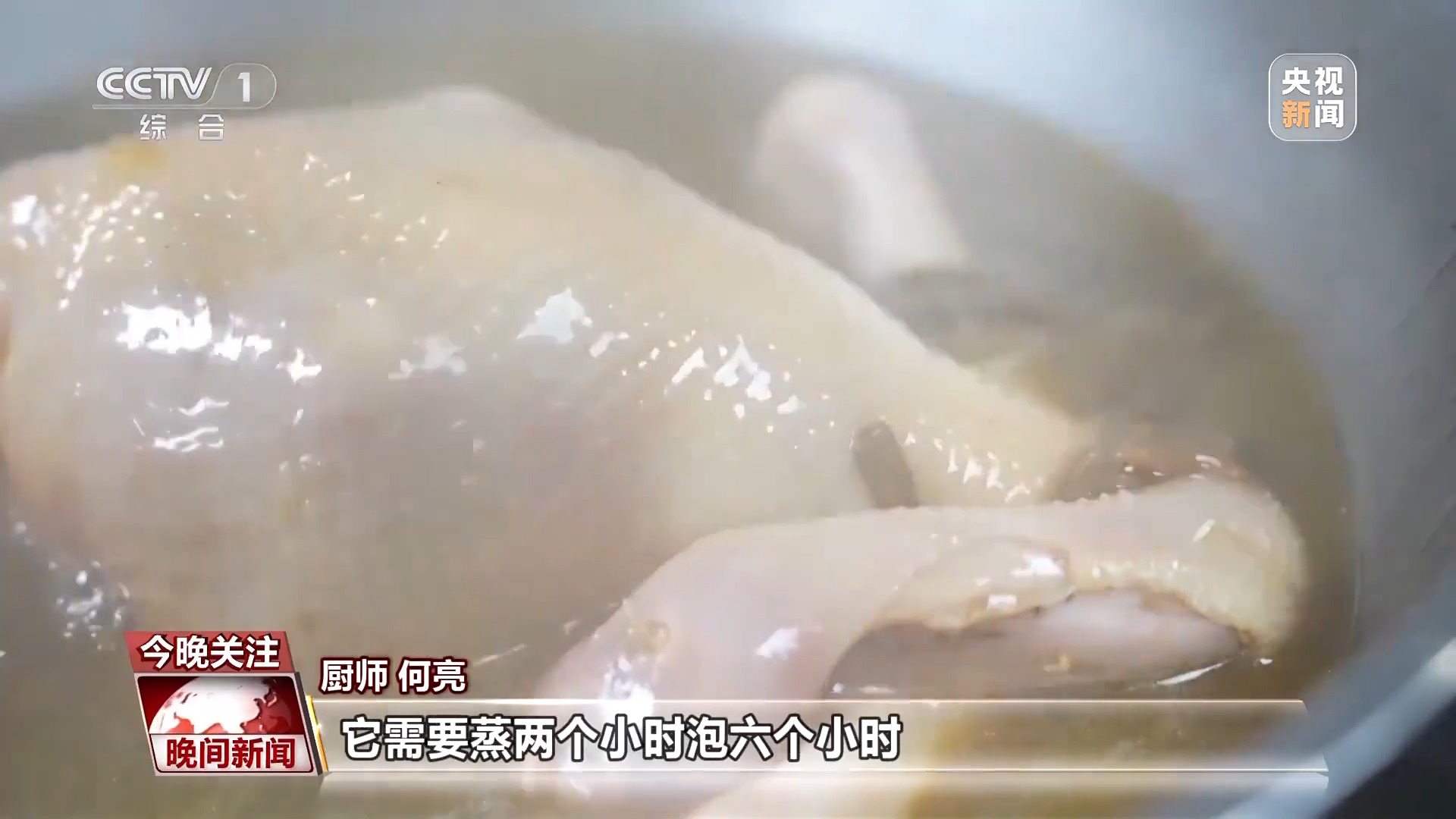 厨师 何亮:它在腌的时候一定要达到一定的时间,需要用一些香辛料,或者花椒盐一块去腌制它,要在十二个小时左右。蒸制的时候需要我们提前调制汤,它需要蒸两个小时泡六个小时,我们提前一天完成其他的三道工序。
