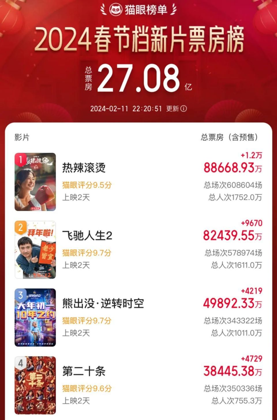 龙年春节,中国电影市场红红火火。猫眼专业版数据显示,截至2月11日22时20分,2024年春节档总票房(含预售)已超过27亿元。2024年度大盘票房(含预售)突破50亿。
