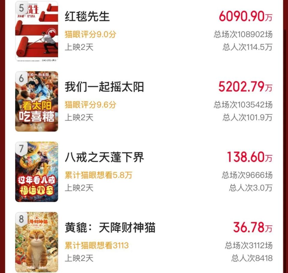 春节档其他4部电影则与前面4部出现了数量级的差距。宁浩导演的《红毯先生》和韩延导演的《我们一起摇太阳》至今距离破亿还遥遥无期,而两部动画电影《八戒之天蓬下界》和《黄貔:天降财神猫》则更是惨不忍睹。