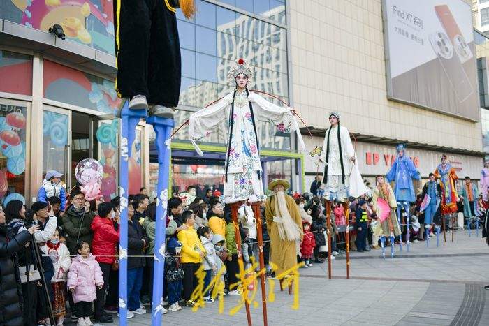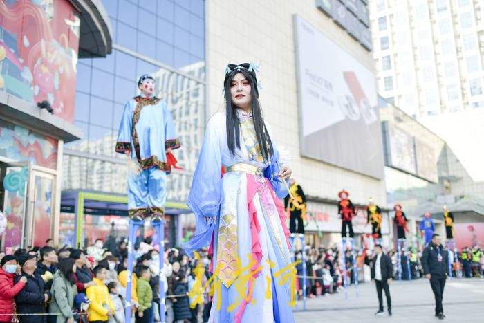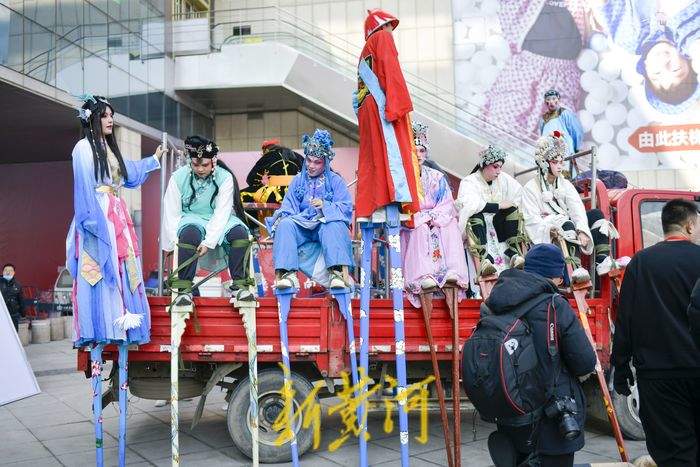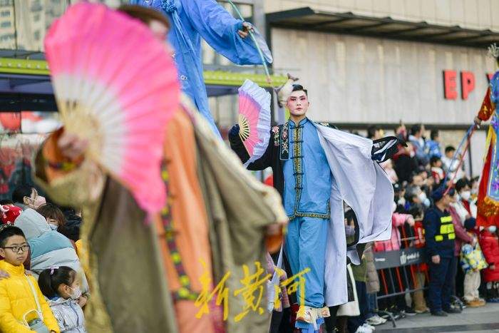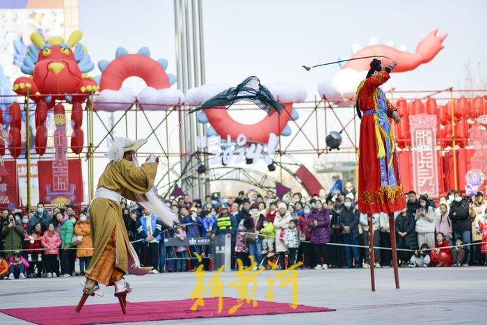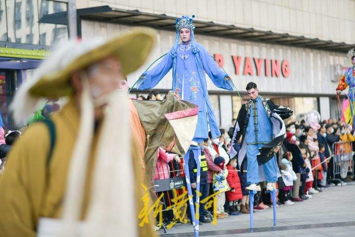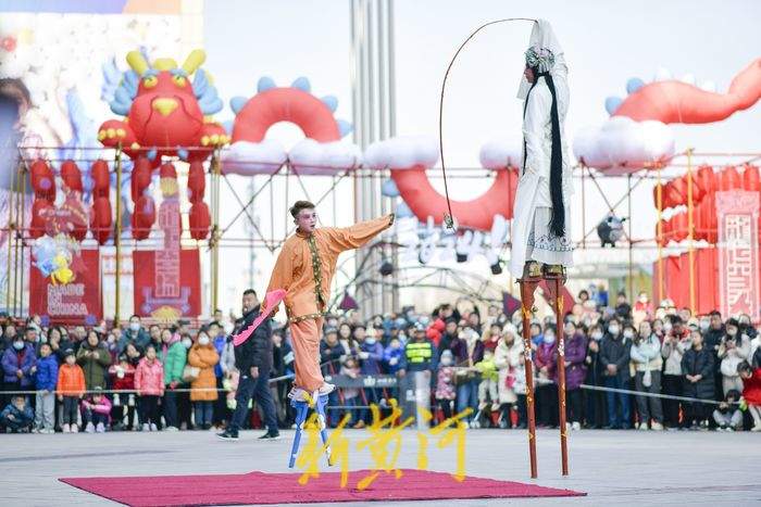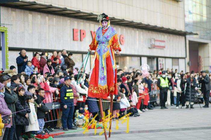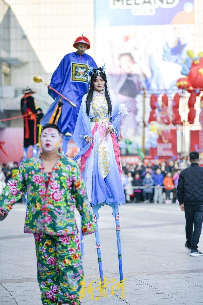 2月11日,在经十路一家商场门前,民间艺人踩着高跷表演一字长蛇、走八字、双排对唱、交叉剪子等队形,同时还表演武松、青蛇戏老渔翁、白蛇戏俊公子为主题的节目,充满年味的表演吸引了众多游客观赏。据了解,新春佳节期间,泉城的街头活跃着多个高跷队伍,每天轮番上演着踩高跷表演,人气颇高,其中多支队伍每天要表演5至6场,跨越多个区域,每表演完一场就要赶赴下一个表演地点,从上午9点一直持续到晚上8点。