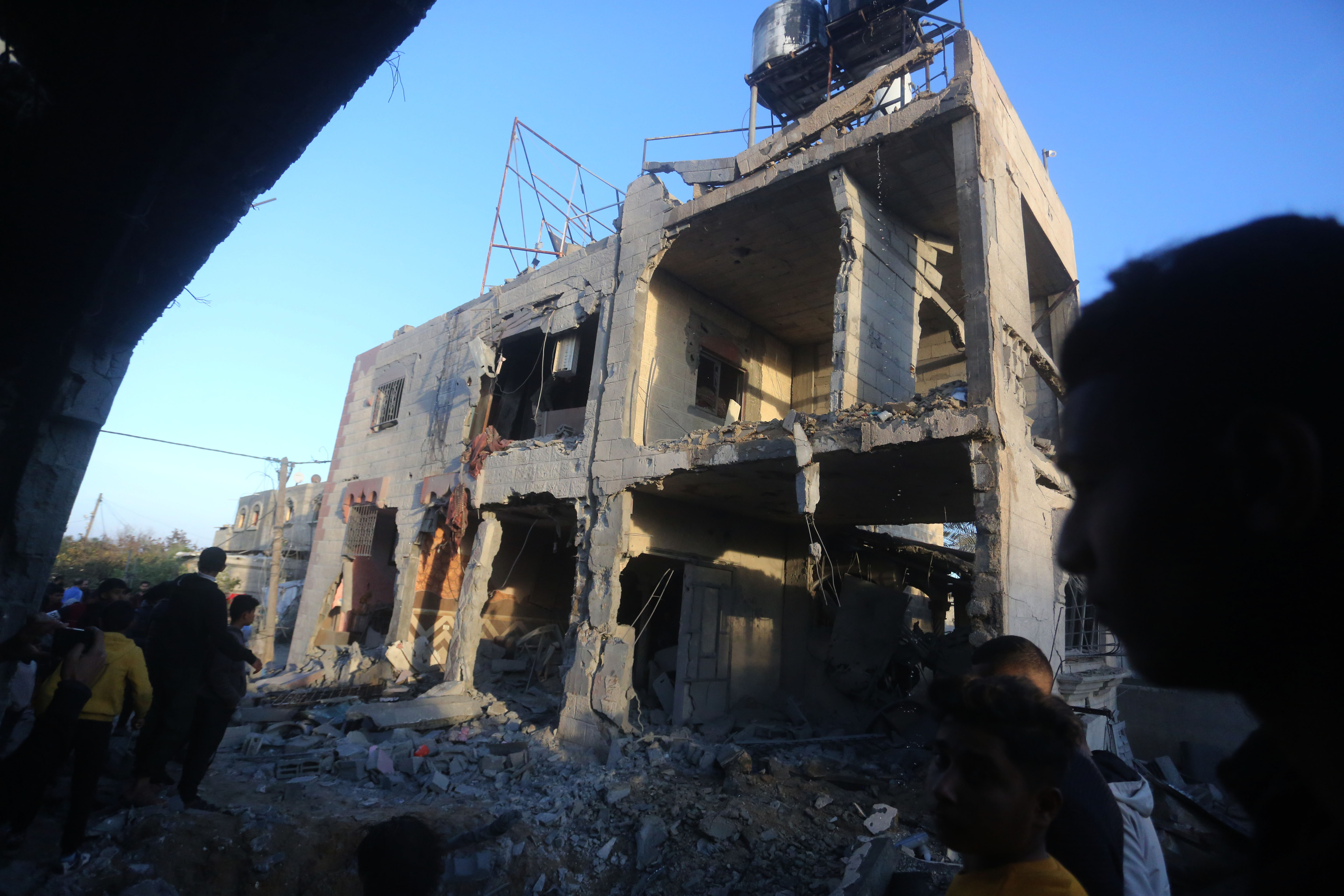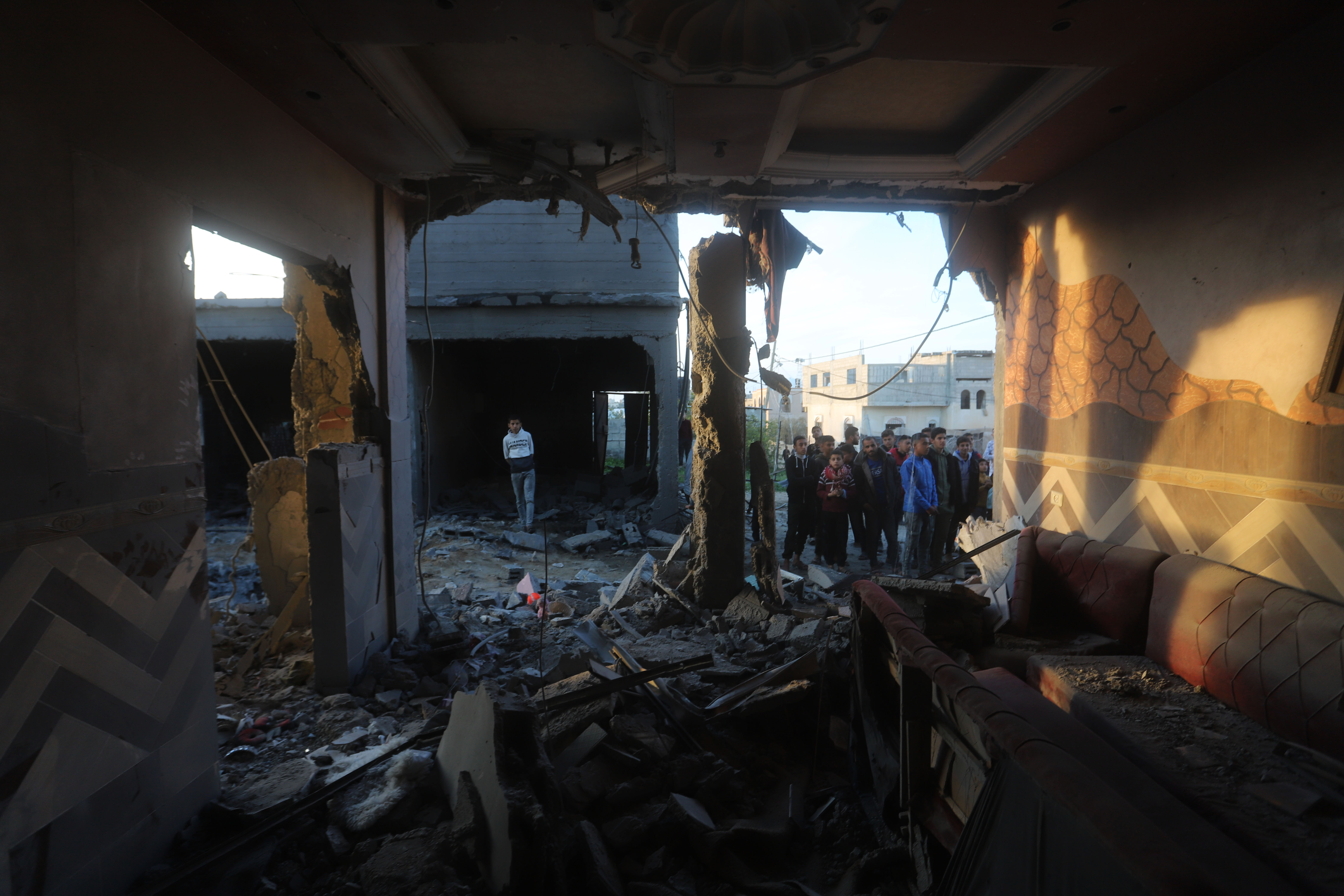 2月11日,在加沙地带南部城市拉法,巴勒斯坦人查看以军空袭后的废墟。新华社发(哈立德·奥马尔摄)