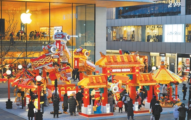 双眼圆睁的小狮子,怀抱金元宝满面喜气的财神爷,扎着红头绳举着红灯笼的女孩,活灵活现的舞龙舞狮队……大年初四,在京城时尚潮流地标三里屯太古里街区,一场由巨型乐高积木人仔组成的新春游园会里,传统新春佳节与潮流文化碰撞融合,吸引了众多市民与游客。