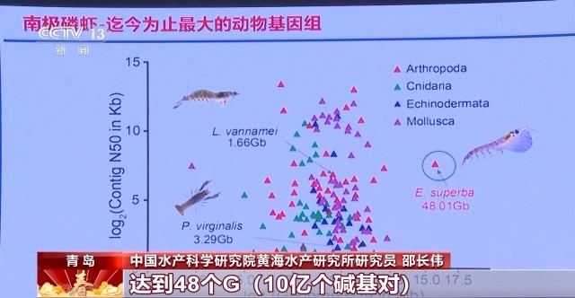 中国水产科学研究院黄海水产研究所研究员邵长伟:我们发现这个南极磷虾整个基因组的大小达到48个G(10亿个碱基对),这是个什么概念?我们人类的基因组才3.2个G(10亿个碱基对),南极磷虾,虽然个儿很小,但它的基因组却那么大,所以,这是一个很有意思的现象。