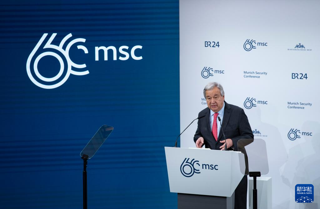 2月16日,在德国慕尼黑,联合国秘书长古特雷斯在第60届慕尼黑安全会议(慕安会)开幕式上致辞。新华社记者 张帆 摄