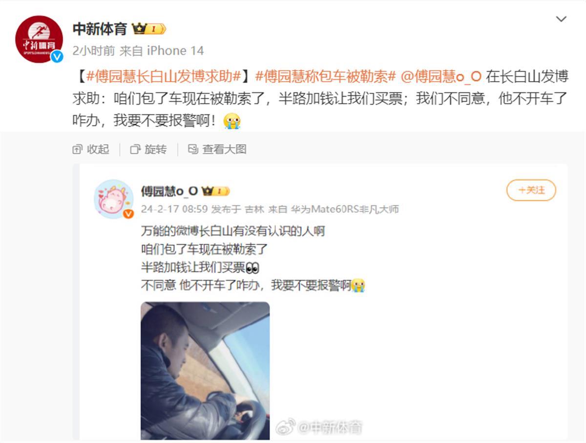 17日上午9时许,傅园慧通过微博求助,“长白山有没有认识的人啊,咱们包了车,现在被勒索了。”傅园慧表示,对方要求半路加钱让买票,不同意加钱,对方就不开车。