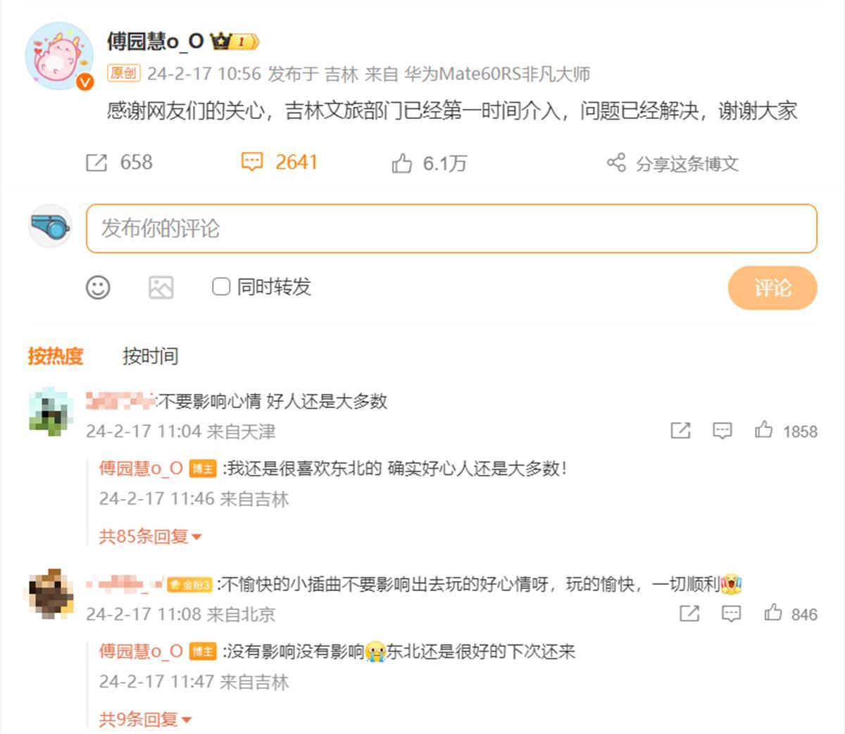 上午11时许,傅园慧再发微博称,吉林文旅部门已经第一时间介入,问题已经解决。她表示自己还是很喜欢东北的,下次还来。