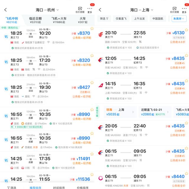 2月17日下午,潮新闻记者从某OTA平台(在线旅行平台)查阅发现,明后两日从海口到上海、杭州等地的直飞经济舱机票几乎售罄,其余中转换乘机票价格也在8000元左右。