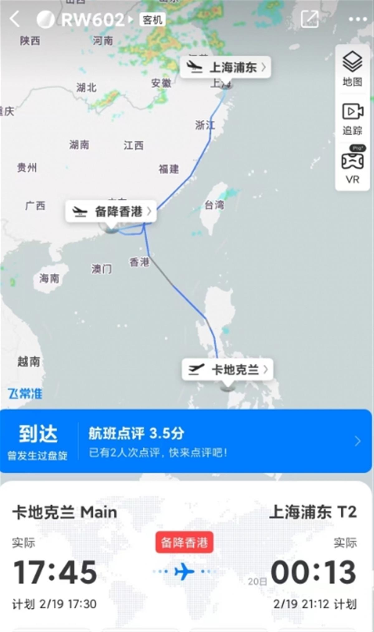 极目新闻记者查询“飞常准查航班”看到,2月19日晚确有一班从菲律宾卡地克兰机场飞至上海浦东机场的航班备降香港后晚点抵达上海。