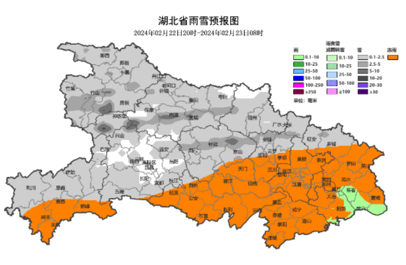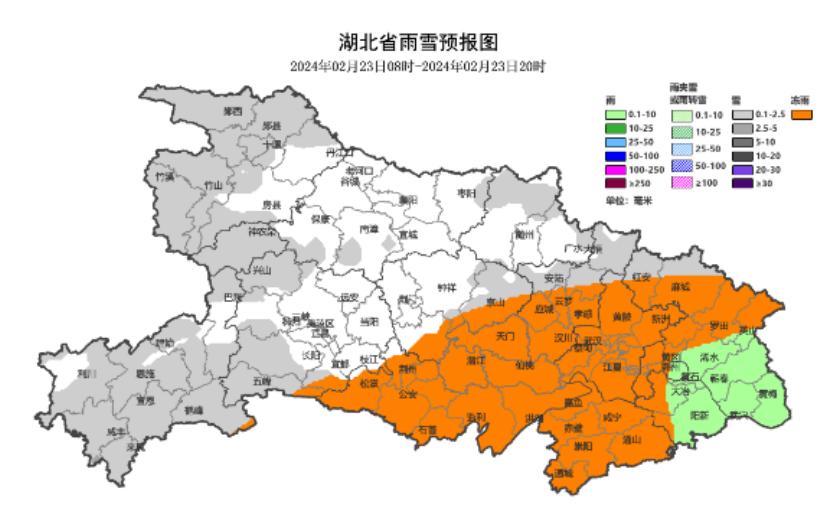 21日至25日,湖北省有低温雨雪冰冻天气。全省有冻雨、冰粒、纯雪,积雪深度中北部地区6~12厘米,南部地区2~7厘米,山区15厘米以上;大部分地区有冻雨,冻雨量10~30毫米,其中江汉平原南部和鄂东南等地冻雨量30~50毫米,大部分地区电线覆冰厚度2~10毫米、局地20毫米左右。气温持续偏低,大部地区最高气温-3~1°C,最低气温-5~-1°C、山区-10°C左右。湖北省气象局正处在重大气象灾害(寒潮、低温雨雪冰冻)III级应急响应中。低温雨雪冰冻黄色预警和暴雪蓝色预警持续生效中。