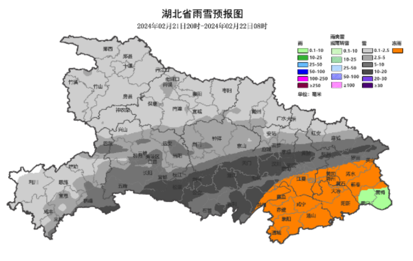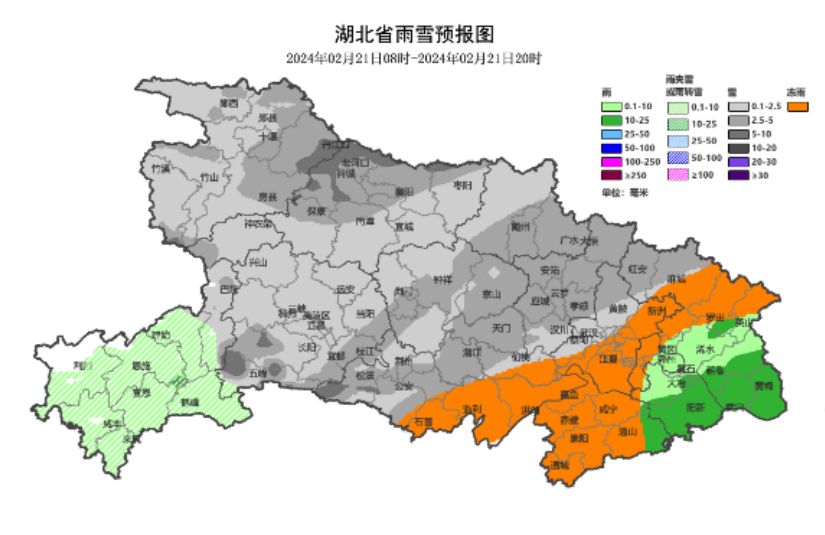 21日08时-22日08时,十堰、襄阳、神农架、随州西部阴天有中到大雪或冰粒;恩施北部、宜昌、荆门、荆州、天门、潜江、随州东部、孝感、武汉北部、黄冈北部冻雨或冰粒转中到大雪、局部暴雪;其他地区小到中雨转冻雨或冰粒。最高气温大部地区-3~1°C,最低气温大部地区-5~-1°C。偏北风4到6级、阵风7到10级。