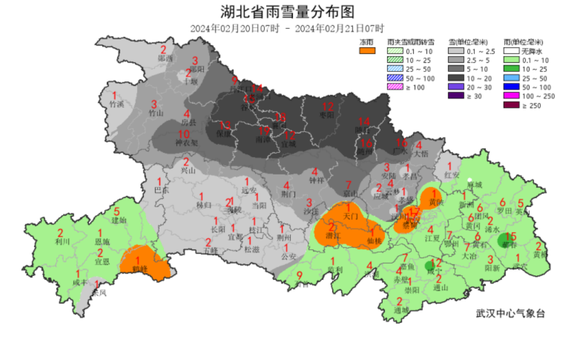 昨天07时至今天07时,十堰、神农架、恩施鹤峰、襄阳、宜昌、随州、荆门、潜江、仙桃、天门、孝感安陆、黄冈红安、武汉东西湖区、黄陂区、蔡甸为冻雨、冰粒、雨夹雪或雪;恩施巴东和来凤、荆州城区、松滋和公安、孝感大部冰粒;18县(市、区)出现积雪,积雪深度较大广水4厘米、襄阳南漳3厘米、老河口2厘米、神农架2厘米、荆门2厘米、孝感大悟2厘米;电线积冰较大的有随州广水3.2毫米、荆门城区2.0毫米和沙洋1.0毫米、 神农架1.2毫米、孝感安陆0.5毫米;恩施局部、宜昌五峰县城、武汉黄陂、十堰郧阳、荆门沙洋小冰雹;大部出现雷电和6至10级阵风,局部短时强降水。今日06时气温较19日下降10~17°C。