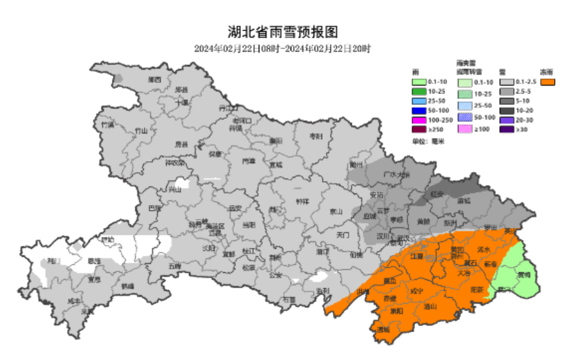 22日08时-23日08时,恩施南部、荆州、天门、潜江、仙桃、武汉南部、黄冈、鄂州、黄石、咸宁阴天有冻雨或冰粒,其他地区小到中雪、局地大雪。最高气温大部地区-2~1°C,最低气温北部-6~-3°C、南部-3~0°C。偏北风3到5级、阵风6到8级。