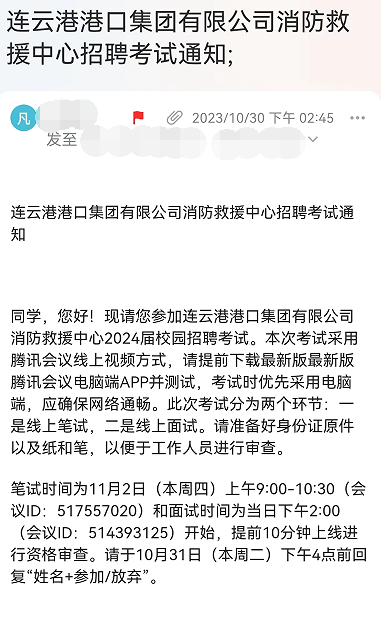 2023年10月30日下午,小温接到招聘单位发来的考试通知,让其于11月2日上午参加线上笔试,11月2日下午参加线上面试,并让其带好相关证件以便工作人员进行审查。