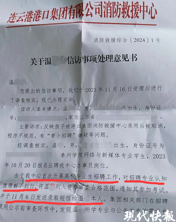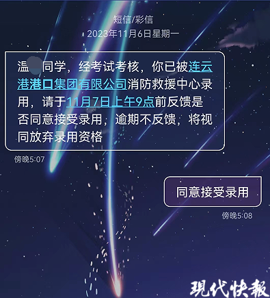 小温先被通知录用后又被取消应聘资格的情况,到底是怎么回事?现代快报记者就此采访了连云港港口集团,该集团人力资源部负责高校招聘的组织人事岗主任陈捷对此事进行了回应。