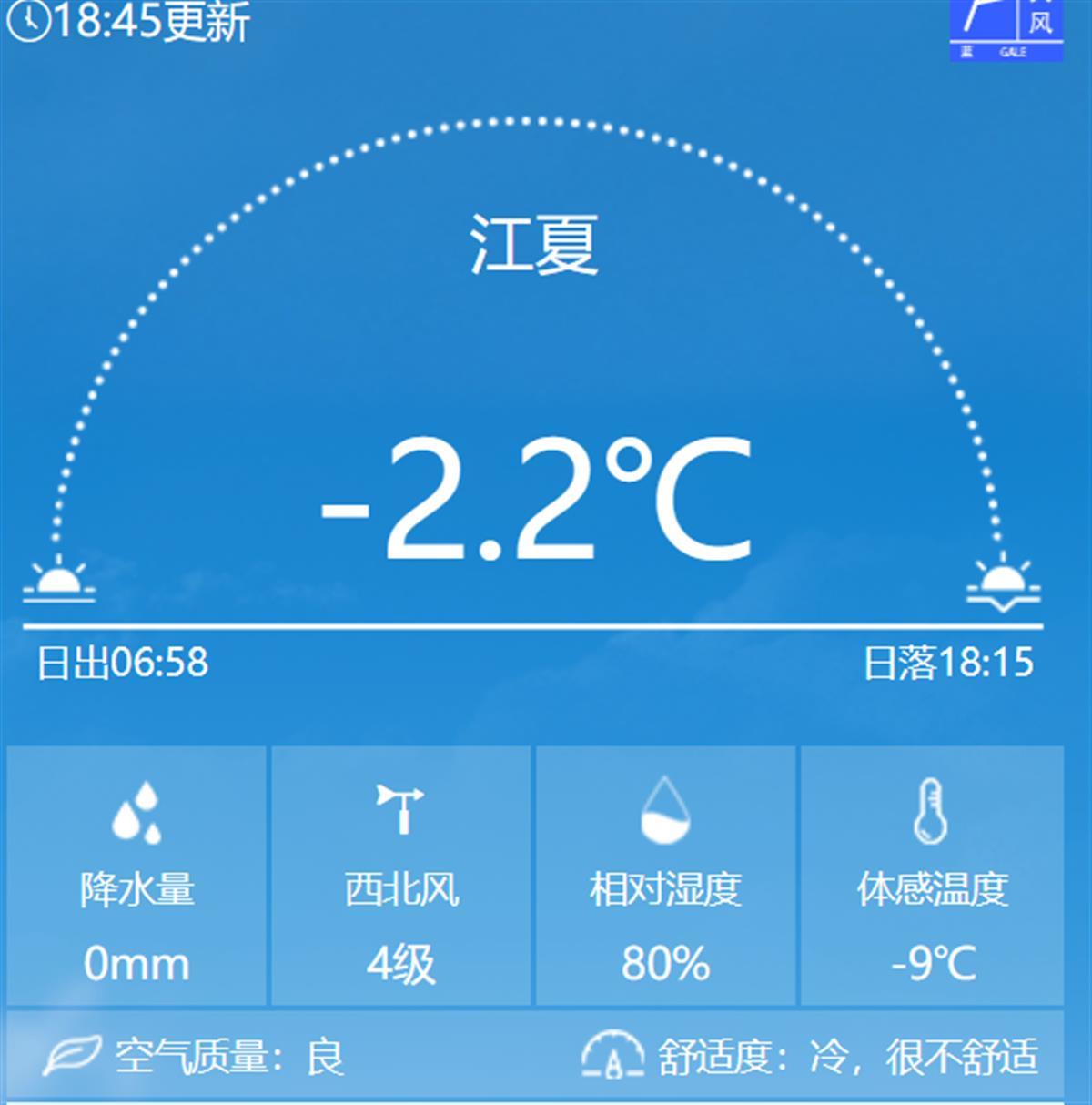 21日晚6时45分,武汉江夏-2.2℃,体感温度-9℃