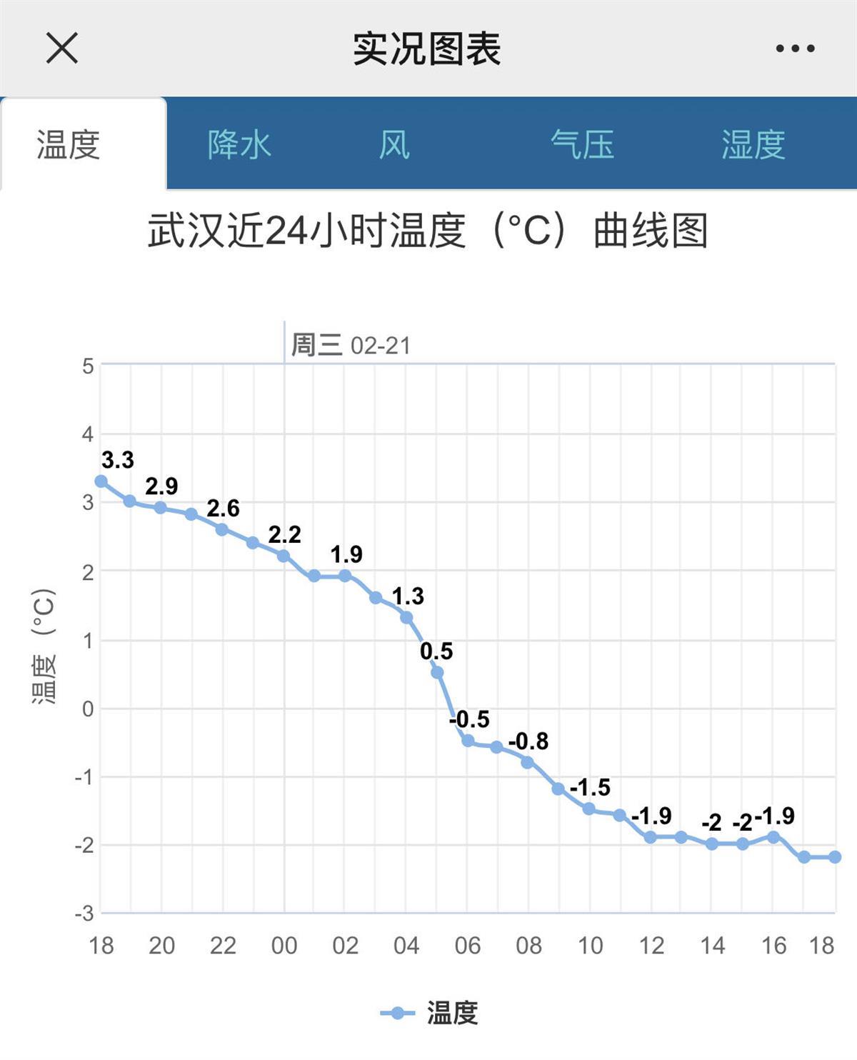 21日凌晨5时武汉0.5℃,6时-0.5℃,跌破冰点