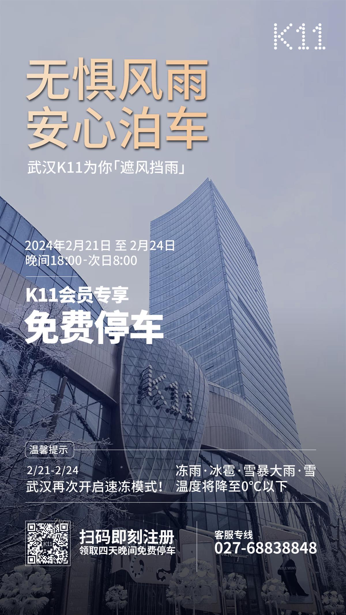 武汉K11(1200个停车位),武汉K11Select(1200个停车位)2月21日-24日18:00-次日8:00地下停车场免费停车。
