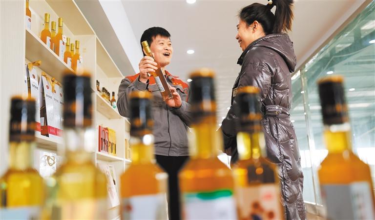 绛县圣波醋业有限公司员工向客商介绍水果醋。该公司利用山楂和樱桃等水果为原料,开发酿造出系列果醋产品,备受消费者青睐。