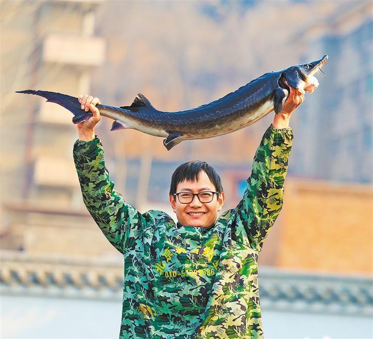 绛县南樊镇沸泉村润尊养殖场,员工在展示刚捕获的冷水鱼。该县通过支部领办、村企结对、村村抱团、资源盘活等方式,实现了村集体经济发展模式由单一到多样、产业由同质到特色的转变。